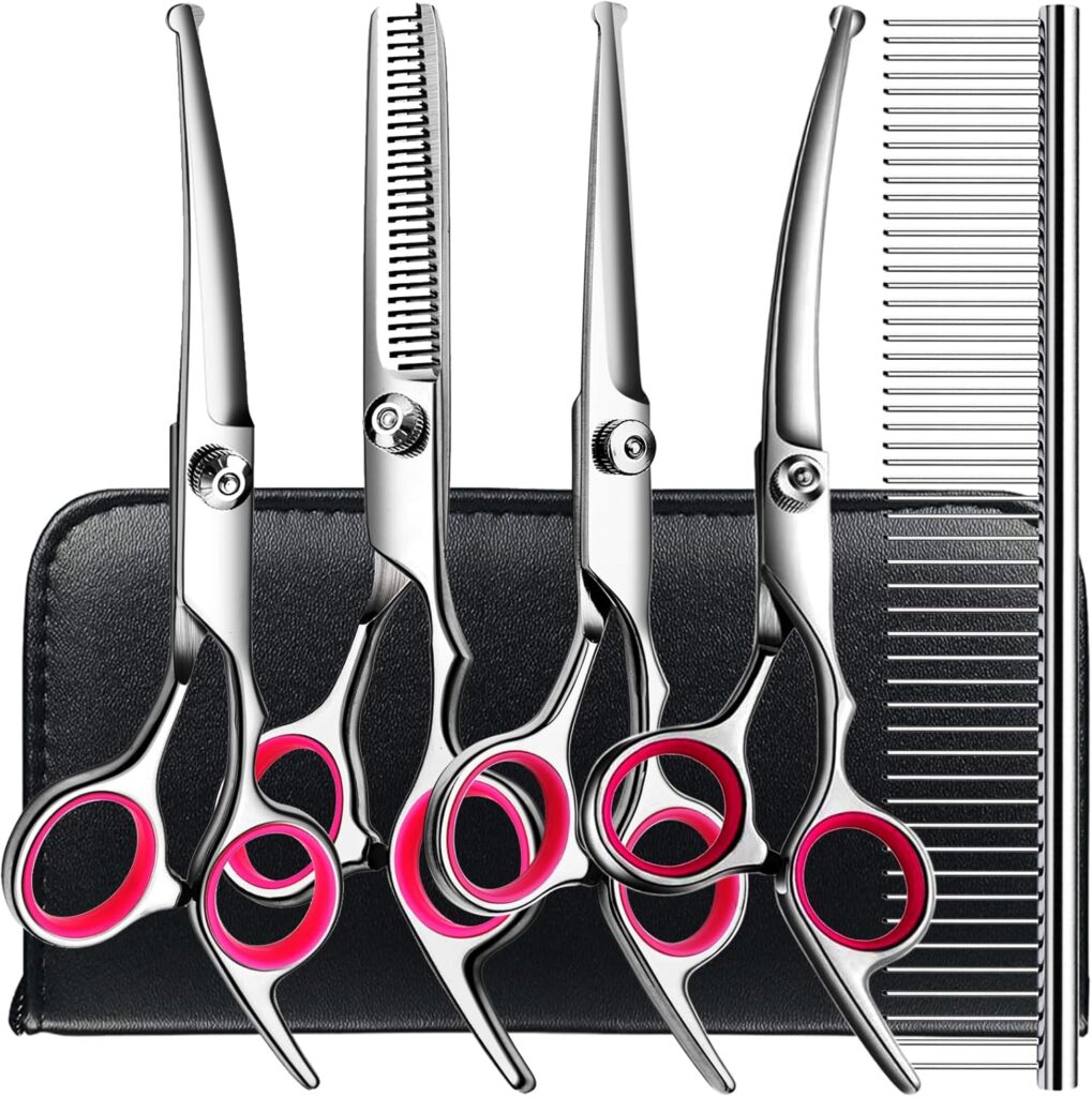• 6 in 1 Dog Grooming Scissors Kit : Dog scissors kit includes 1 dog thinning shears, 2 dog curved scissors, 1 dog straight scissors, 1 grooming comb, 1 cleaning cloth, and 1 black leather case, suitable for home use and professional groomers.
